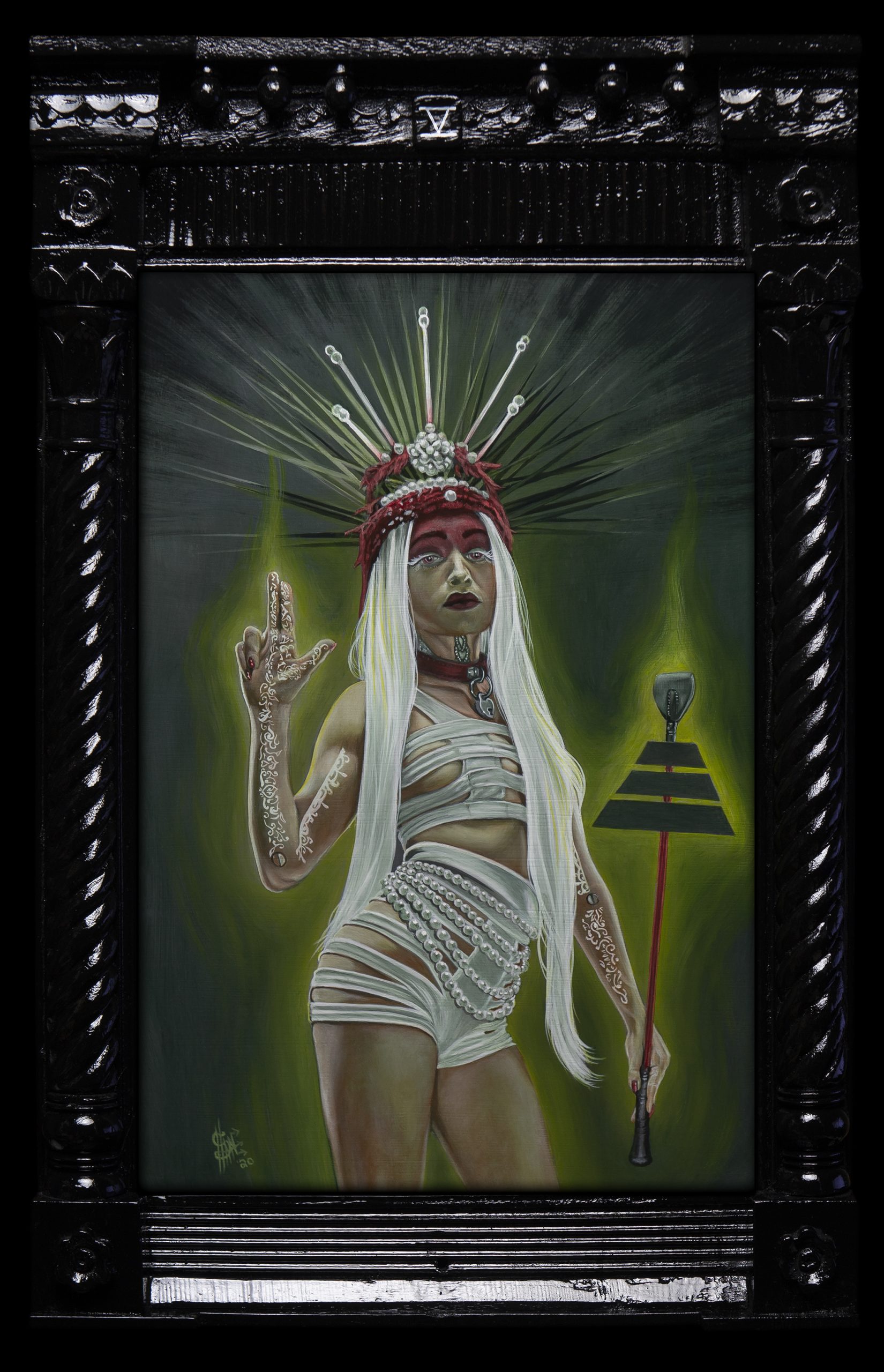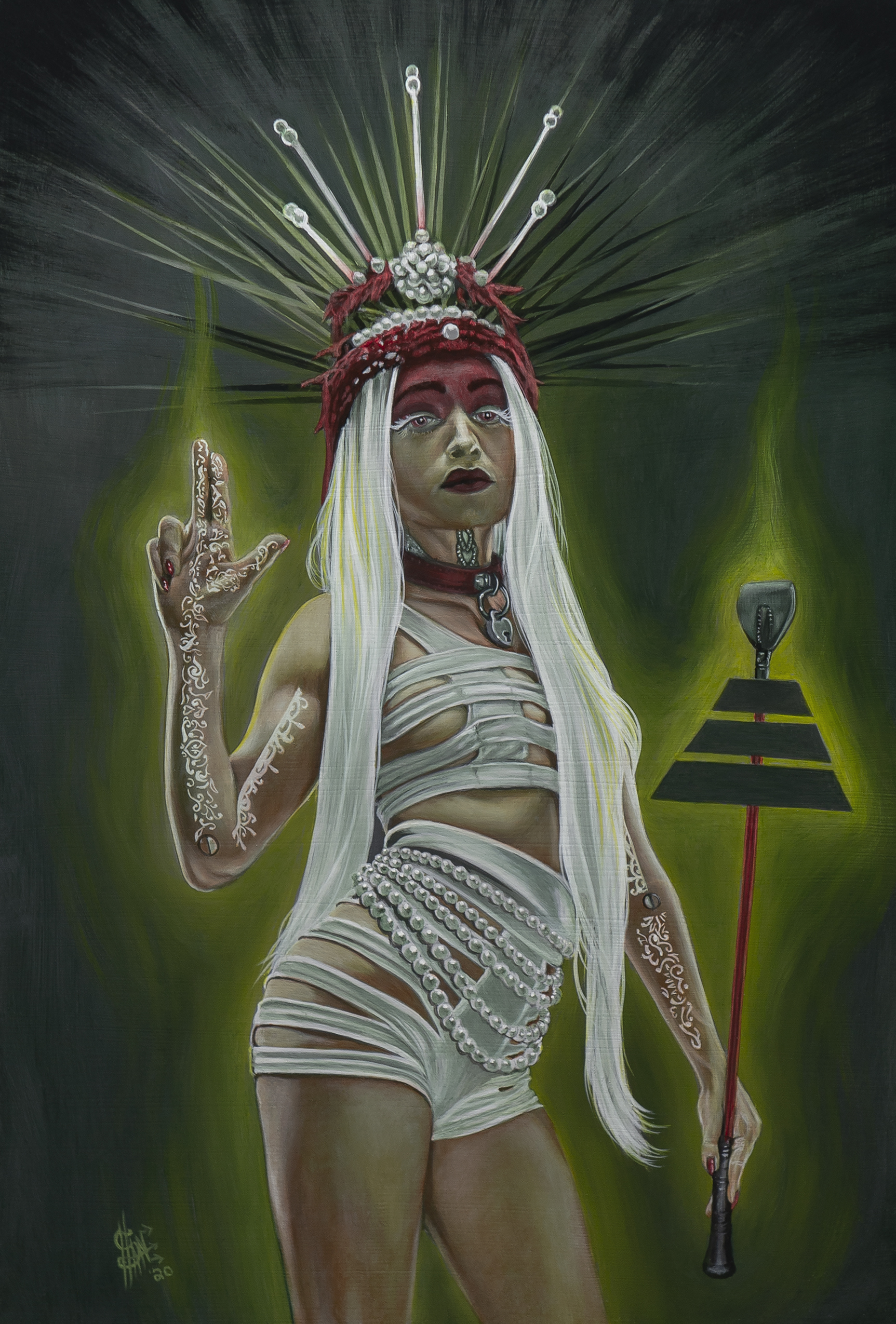 Corinna Naumann draws and paints emotive portraits, LGBTQI+ themes, nature and her inner worlds. She combines different materials experimentally and searches for beauty in details, meaning, growth and disruption. For ARCANA, she turned deep inside herself, as her card supported her decisiveness as an artist in corona times: striving forwards, acknowledging change; re-synergizing neglected aspects of herself. CHARIOT is a hommage to Alphonse Mucha, as to her female instincts and bond to nature, and a very personal self portrait. She is based in Aschheim / Germany and has a background in art history and art education.